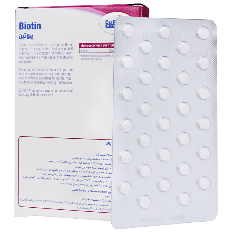 قرص بیوتین ۲۵۰۰ میکروگرم یوروویتال با تامین ویتامین B۷ مورد نیاز بدن به حفظ سلامت پوست، مو و ناخن کمک میکند. علاوه بر این، مصرف این قرص در تامین انرژی و کنترل قند خون در افراد دیابتی موثر است.
