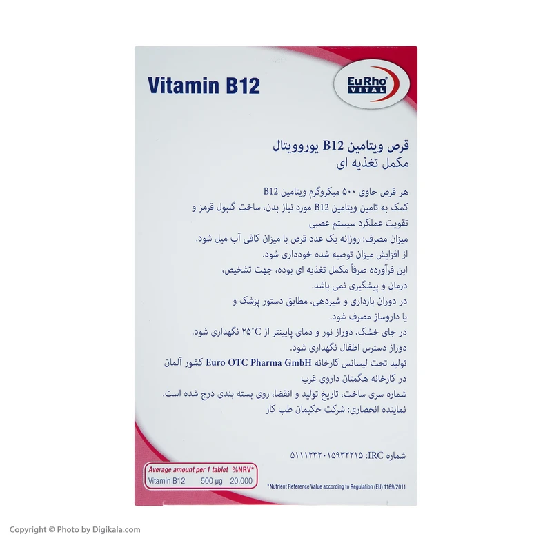 مقدار مصرف قرص ویتامین B12 یوروویتال بسته 60 عددی