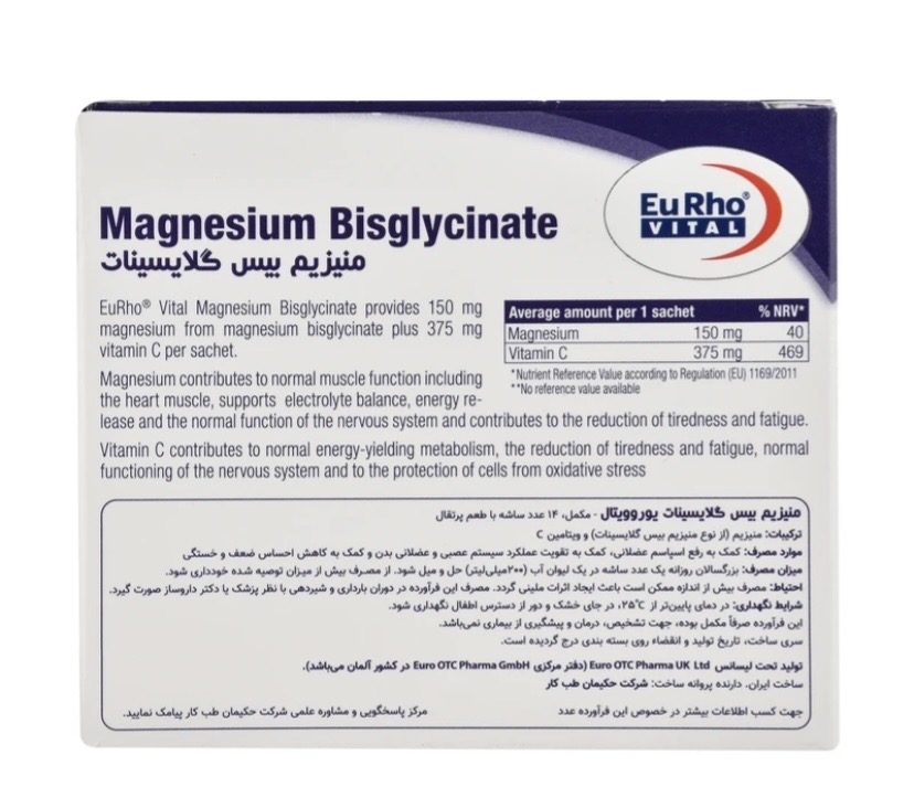 هر ساشه حاوی 150 میلیگرم منیزیم به صورت بیسگلیسینات و 375 میلیگرم ویتامین C است.