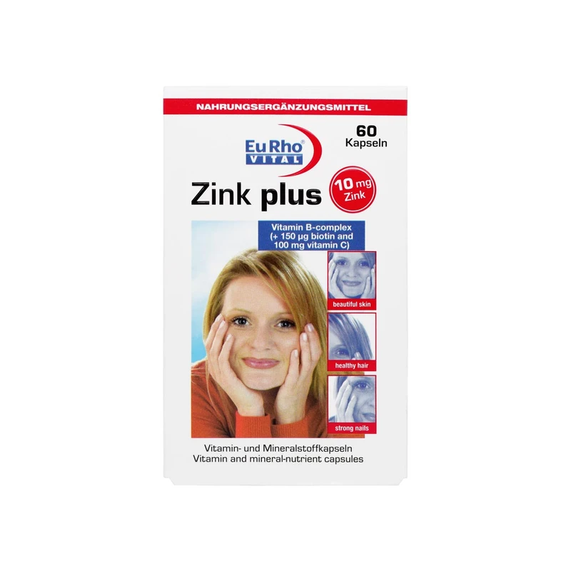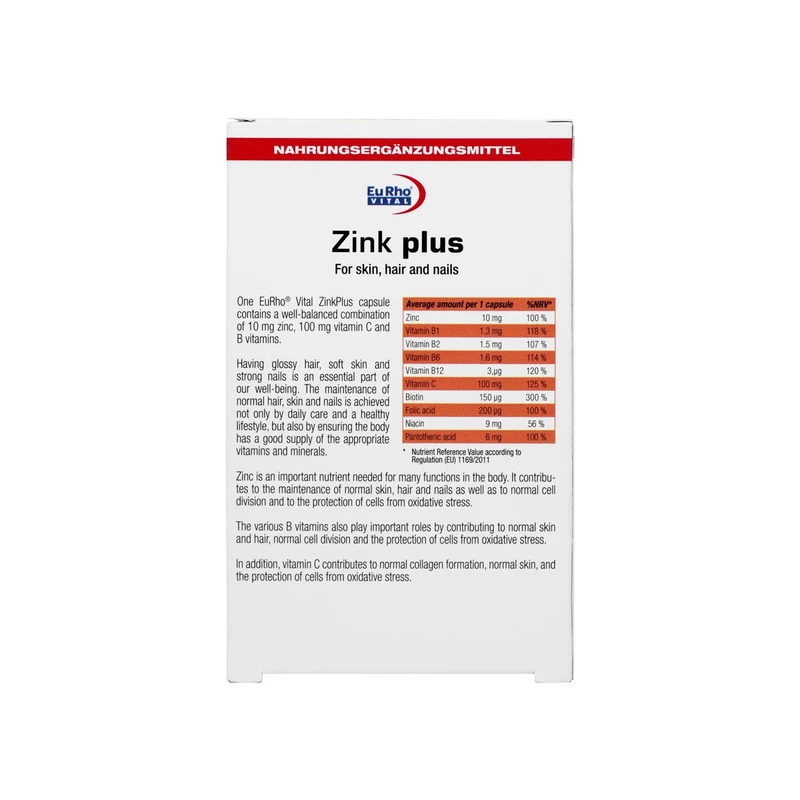 از دیگر ترکیبات زینک پلاس یوروویتال، ویتامین های گروه B هستند. تمام 8 ویتامین از گروه ب، اعم از ویتامین B1 ،B2 ،B6 ،B12، فولیک اسید، نیاسین، بیوتین و پانتوتنیک اسید در محتویات زینک پلاس موجود هستند. دریافت مقادیر کافی از ویتامین های ب کمپلکس برای داشتن پوستی زیبا، مو های درخشان و ناخن های محکم ضروری است. بیوتین موجود در این فرآورده برای تقویت رویش مو و بهبود کیفیت بافت پوست مفید است. با مصرف کپسول زینک پلاس یورو ویتال خیالتان از دریافت مقادیر مورد نیاز از ویتامین های ب کمپلکس راحت خواهد بود.